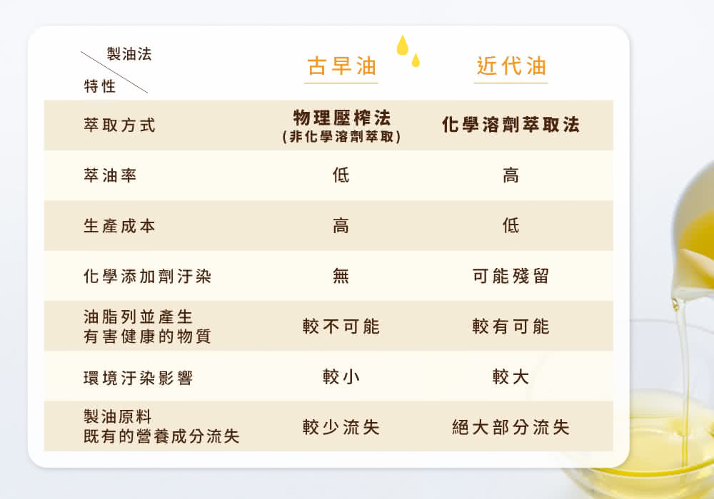 有別於化學溶劑萃取法(使用正己烷萃油率高),傳統壓榨法(非化學溶劑萃取)的萃油率低,