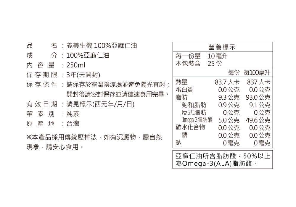 義美生機 100%亞麻仁油品250ml 3件組(omega-3)